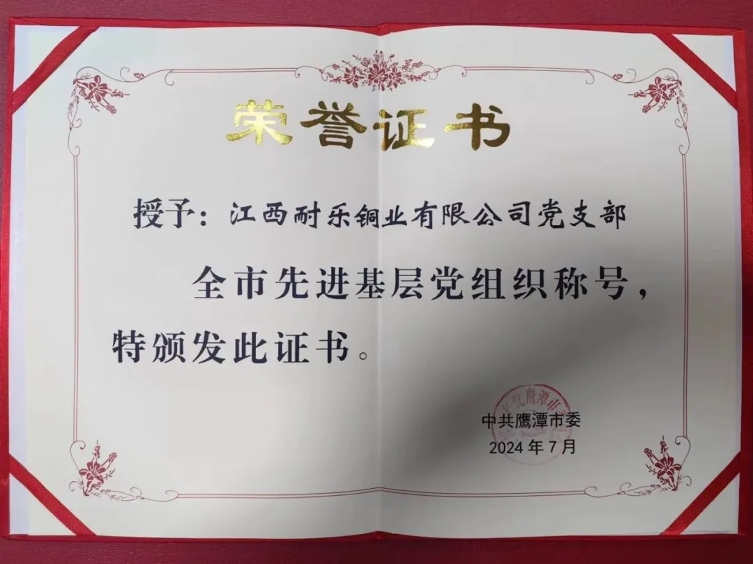 为庆祝中国共产党成立103周年、新中国成立75周年,根据《中国共产党党内功勋荣誉表彰条例》和省委实施办法有关规定,全市表彰“两优一先”对象中,江西耐乐铜业有限公司党支部再次获评“全市先进基层党组织”。